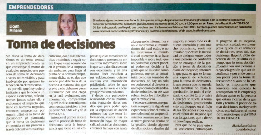 "TOMA DE DECISIONES". Diario La Exitosa, 13 de Agosto 2017.