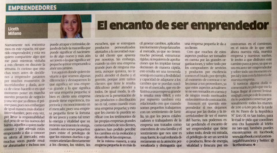 "El encanto de ser emprendedor".Diario La Exitosa, 13 de Diciembre 2015.
